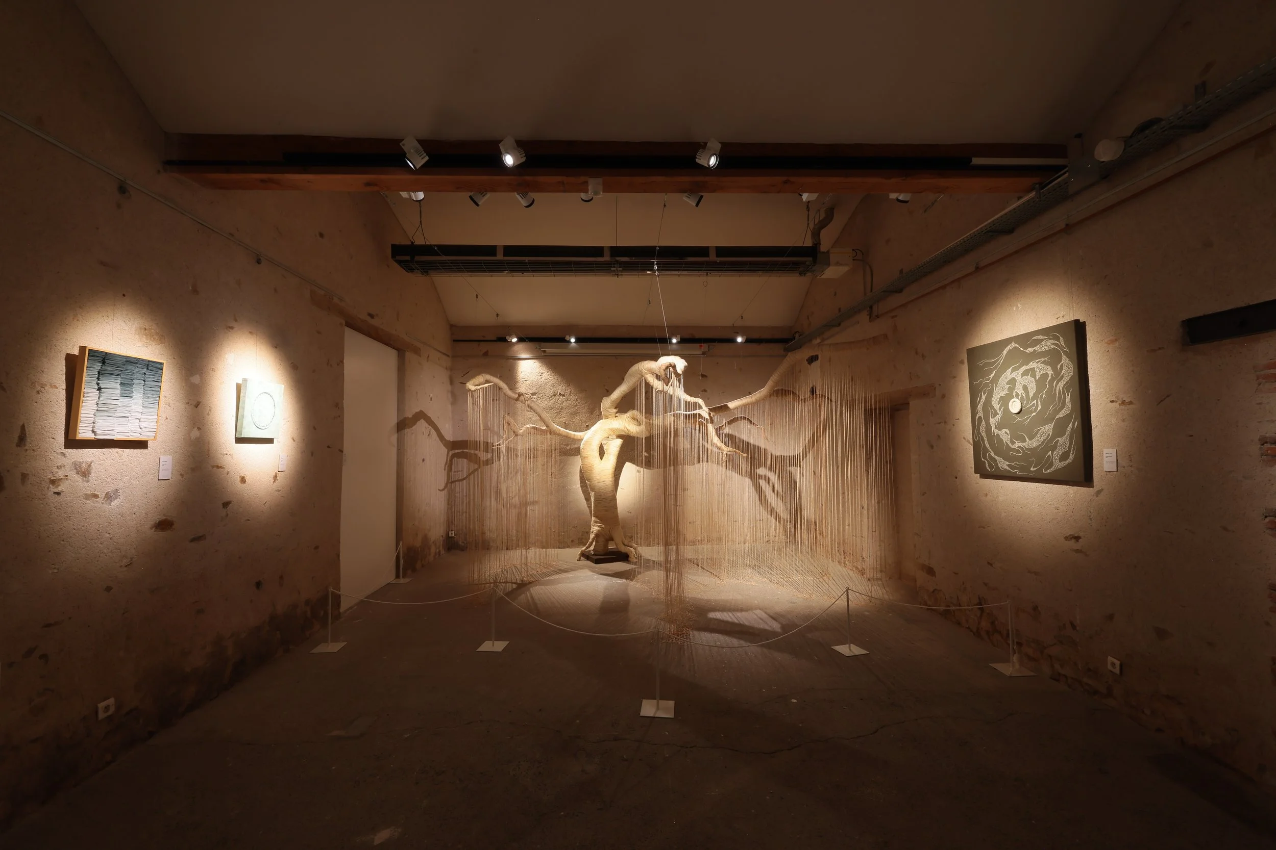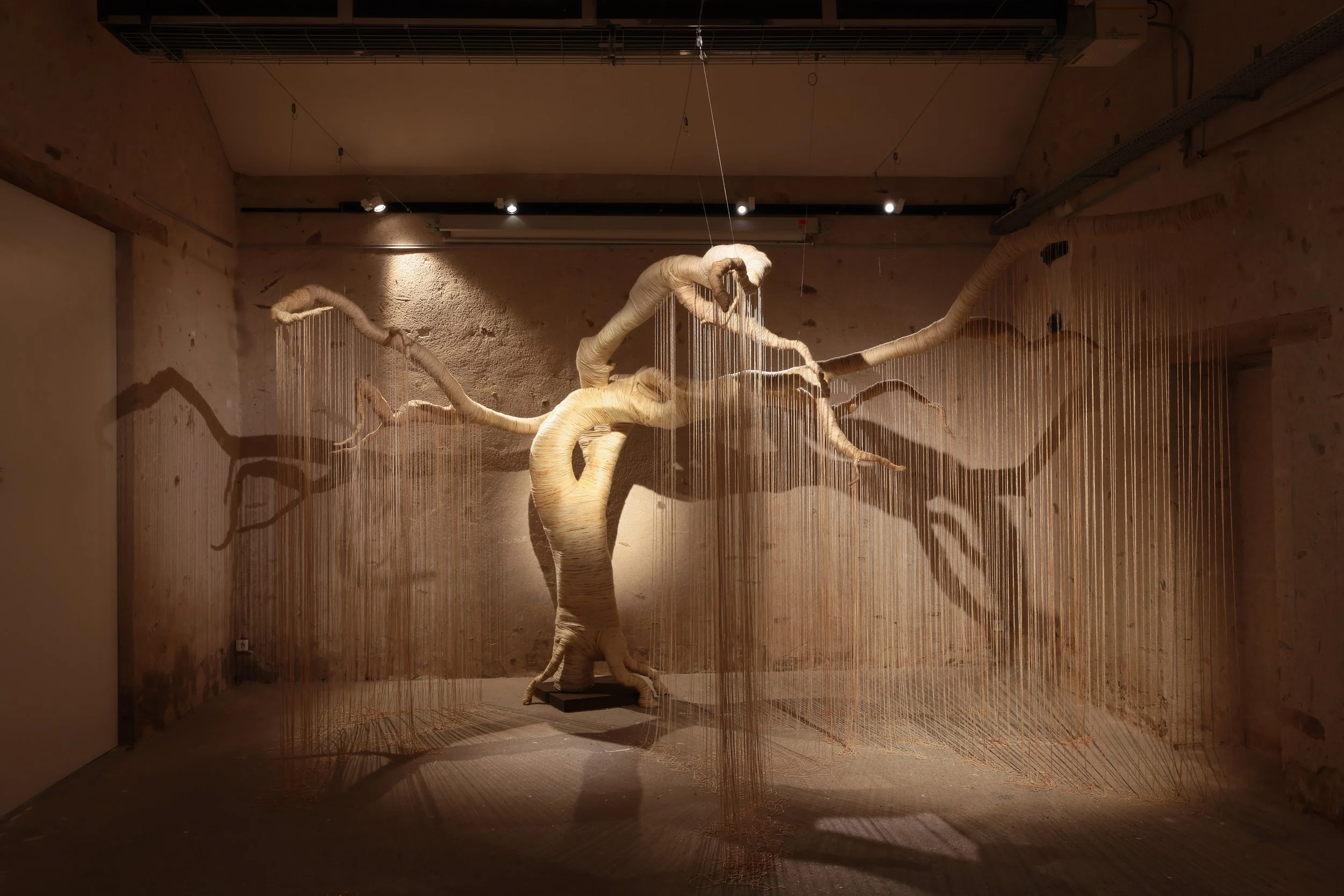 2024 - Free standing installation - Drift wood tree trunk and branches assembled. Metal wire, wool yarn and cotton string dyed with tree bark and leaves from the Ash tree, originally thought to be the tree of life from the Norse mythology called Yggdrasil.