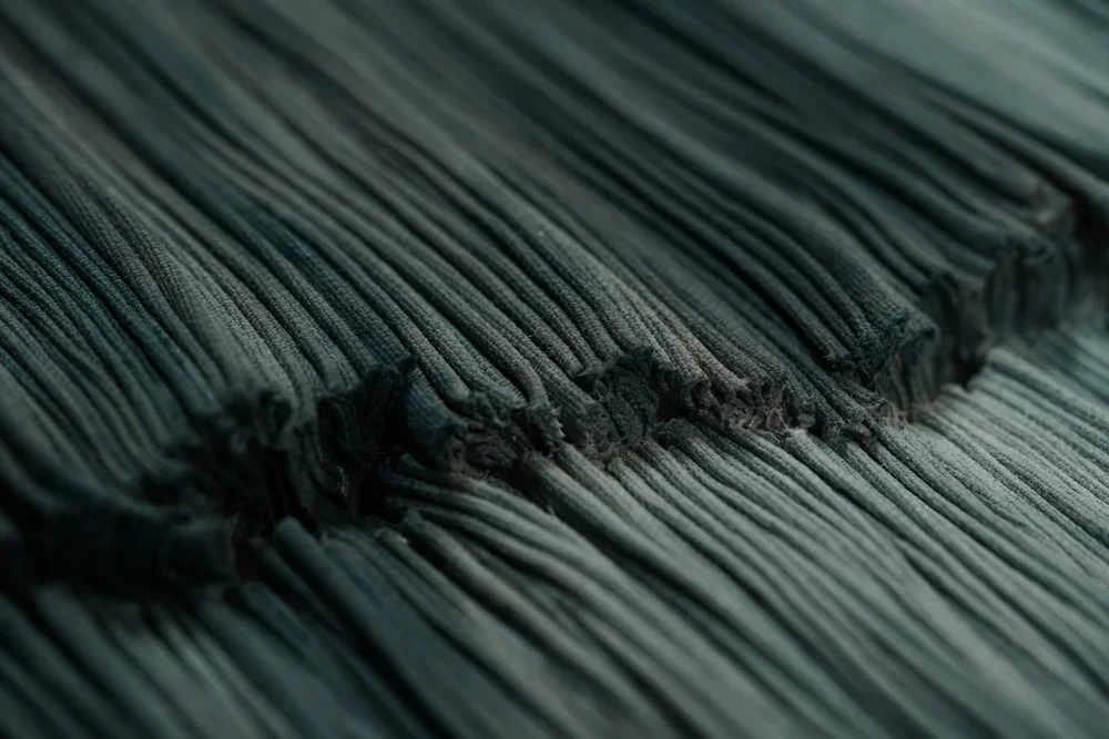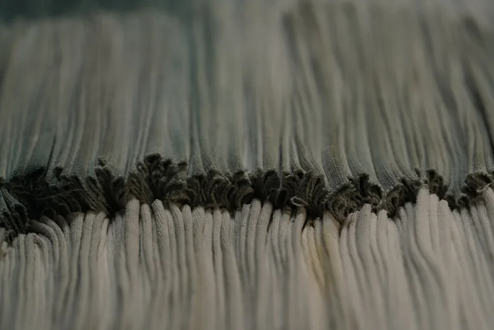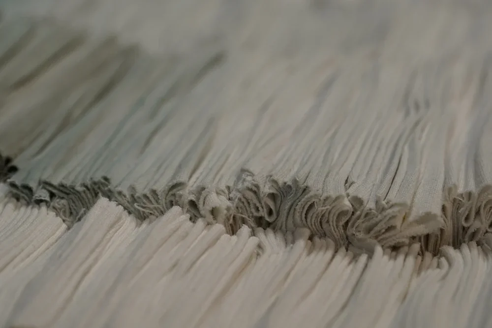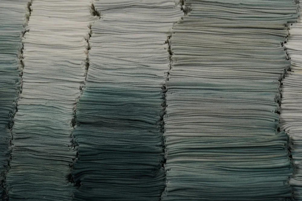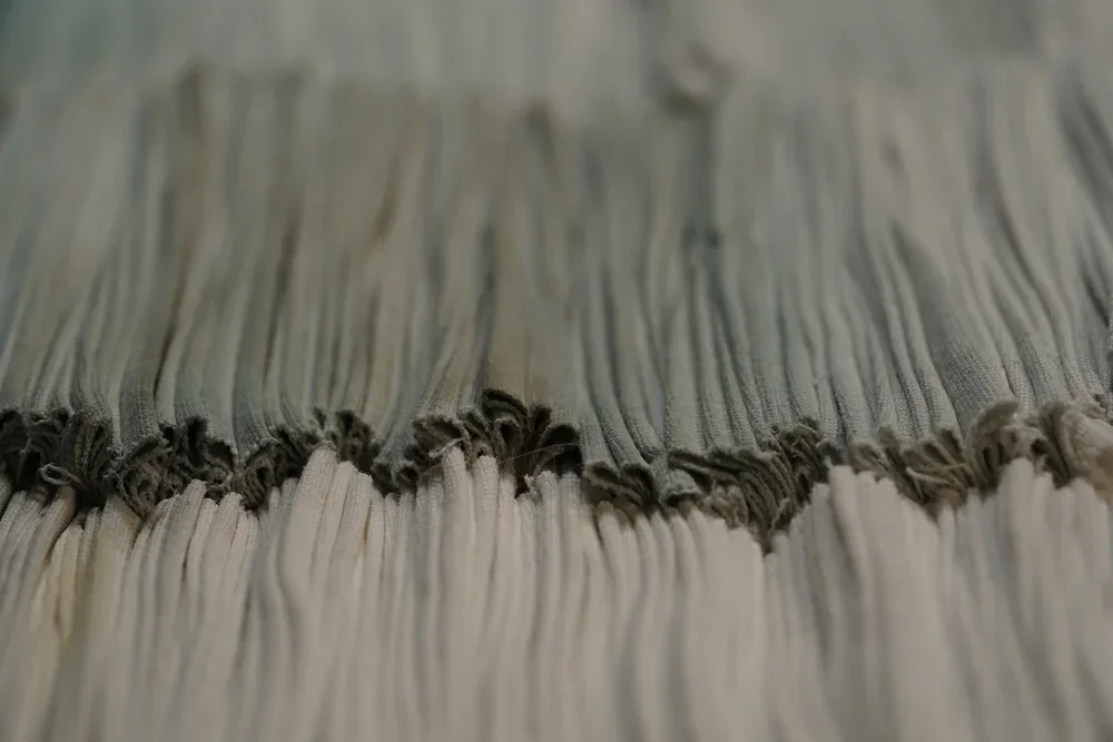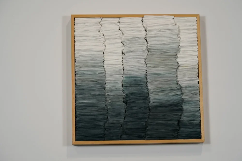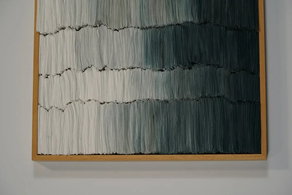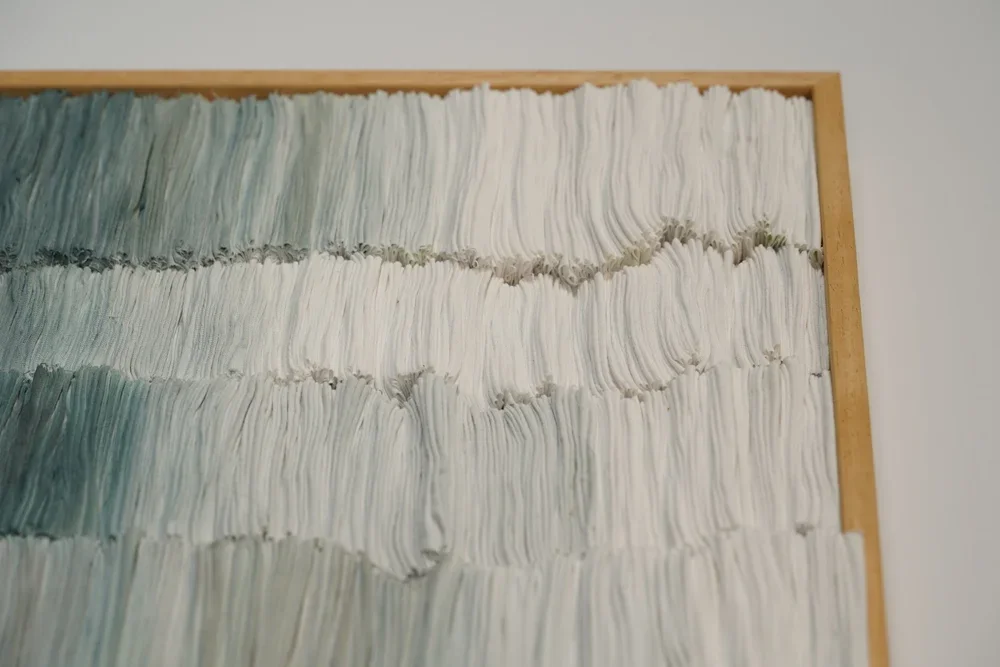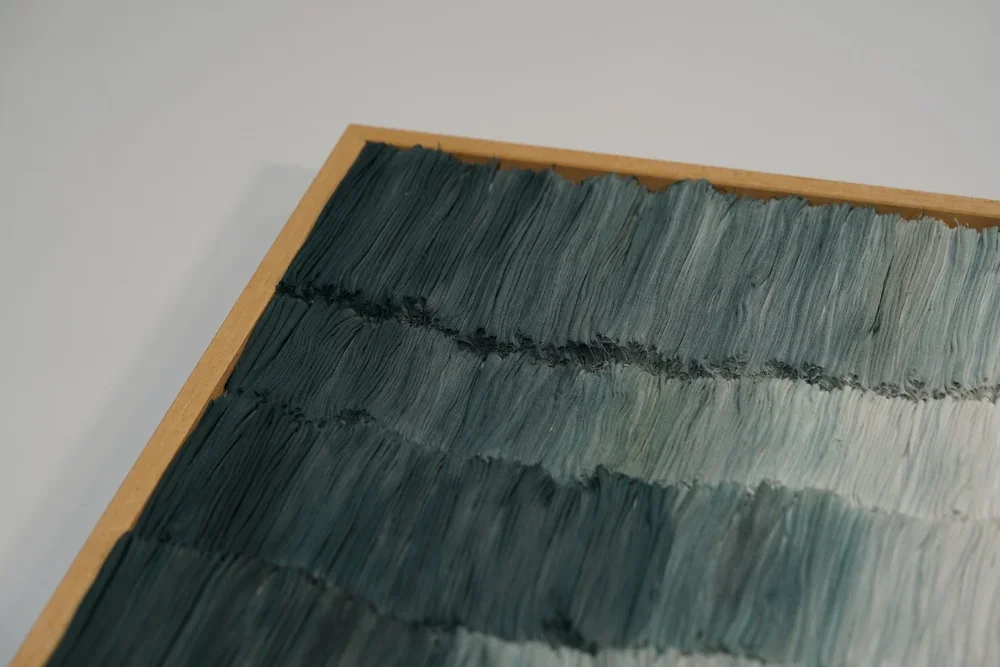 2022 - 50cm x 50cm - Layered strips of material. Hand painted. Pinned and glued within frame