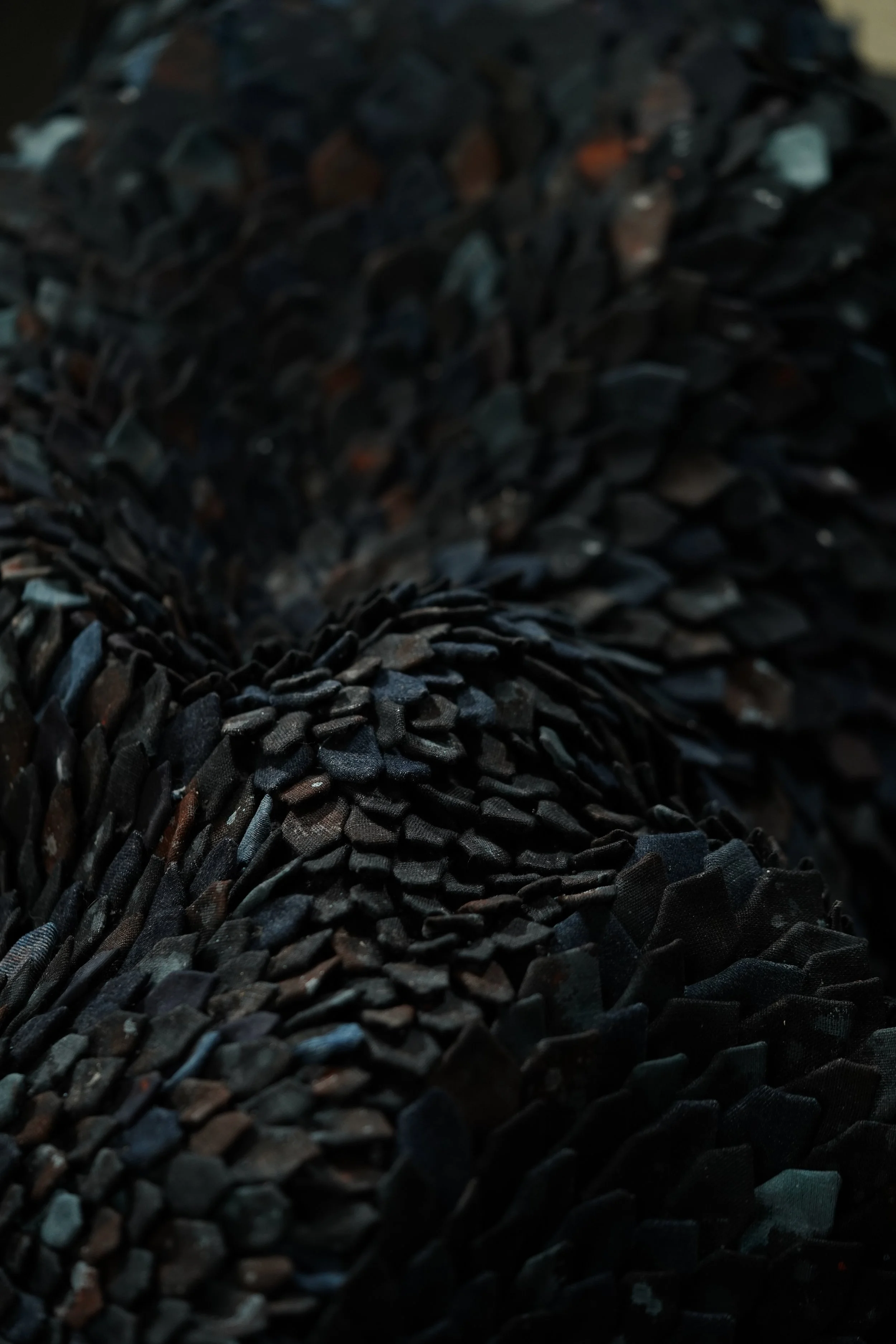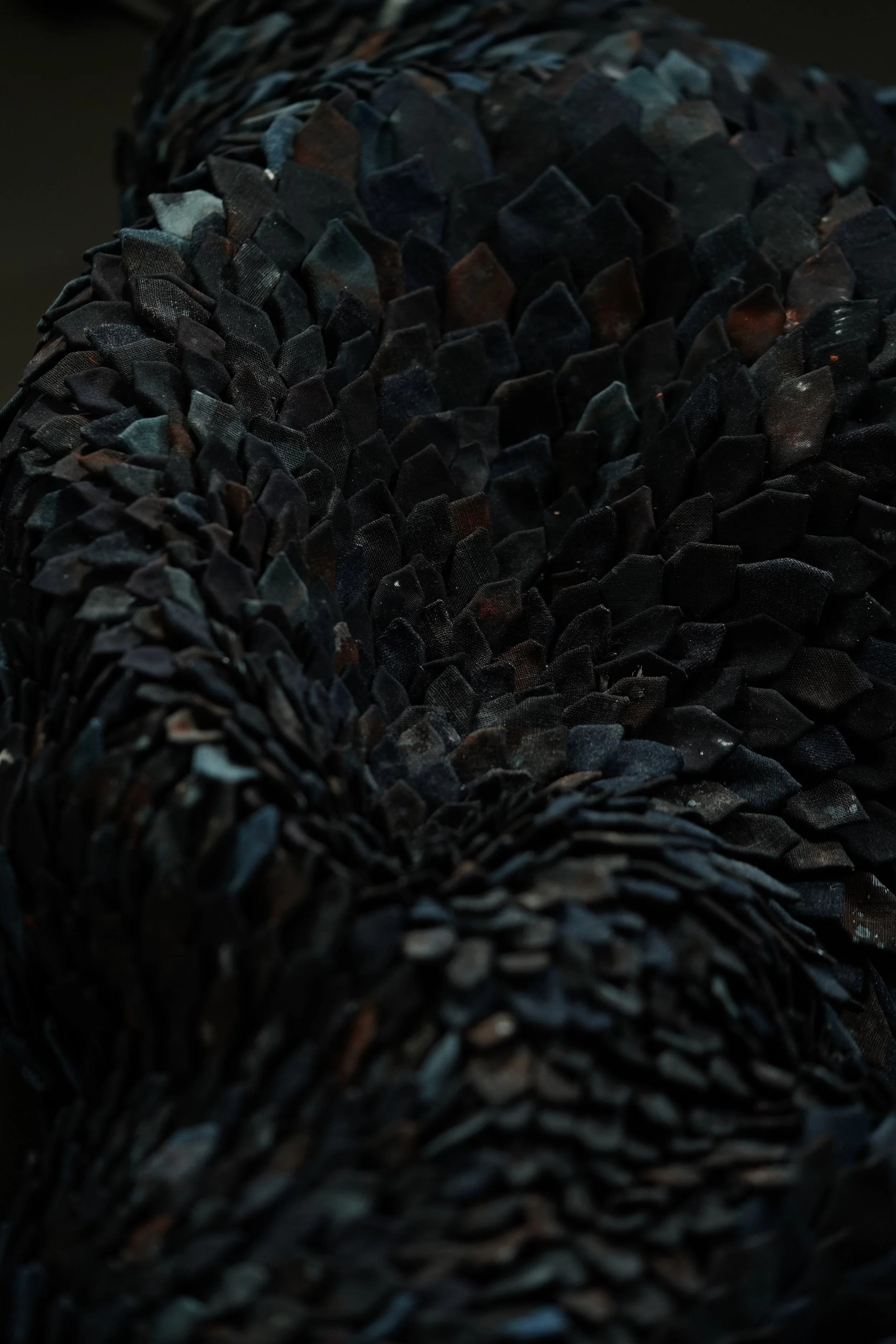 2023 - Irregular shape. Approx. 145cm long x 60cm wide - Wall installation. Styrofoam structure sculptured out of recycled fishermen boxes. Origami folded, rust stained material: Linen, cotton and denim. Pinned onto Styrofoam structure.
